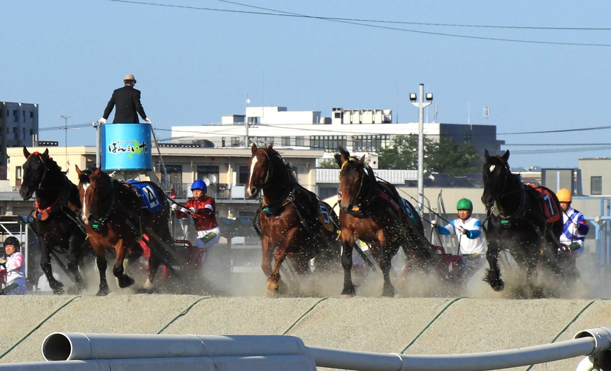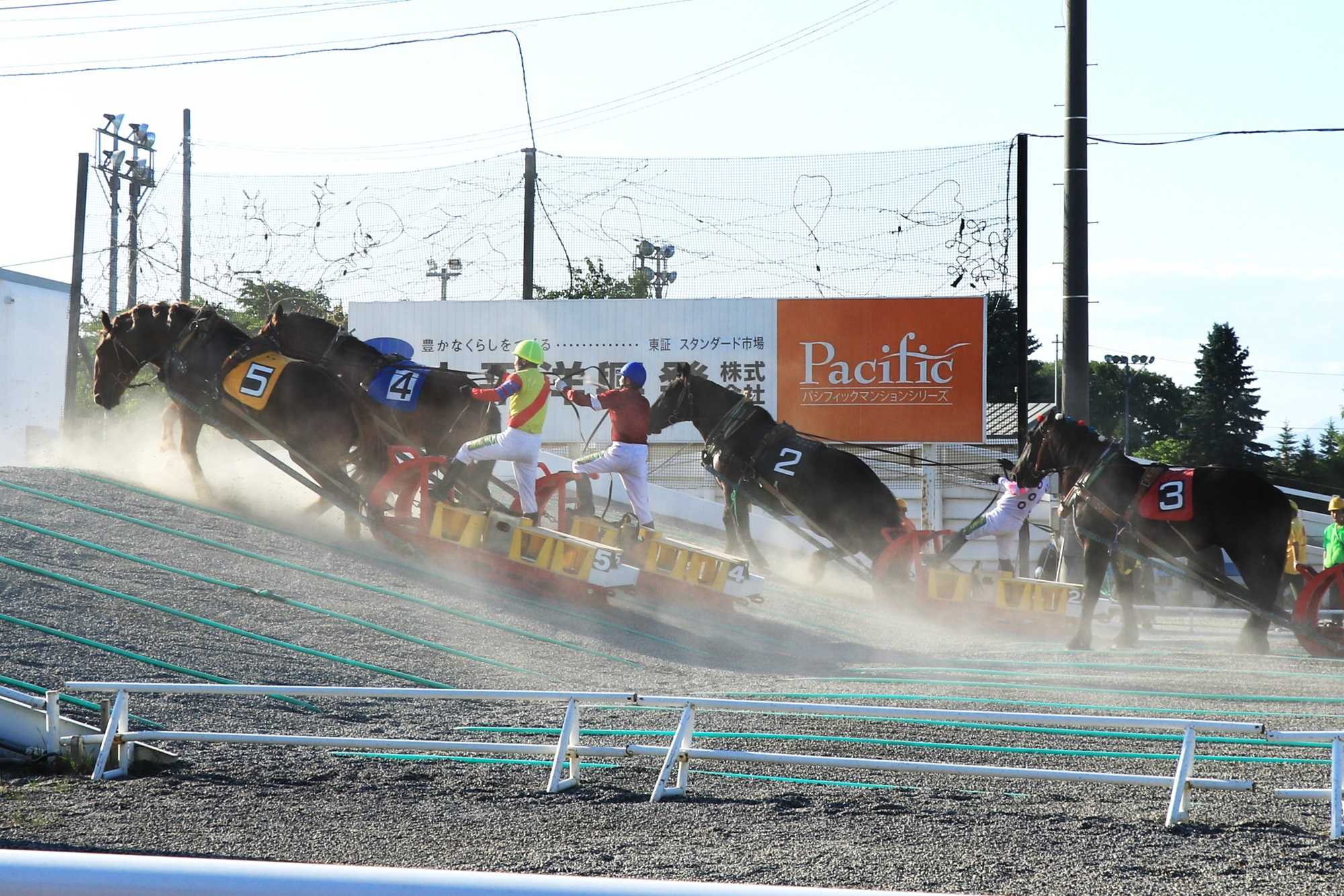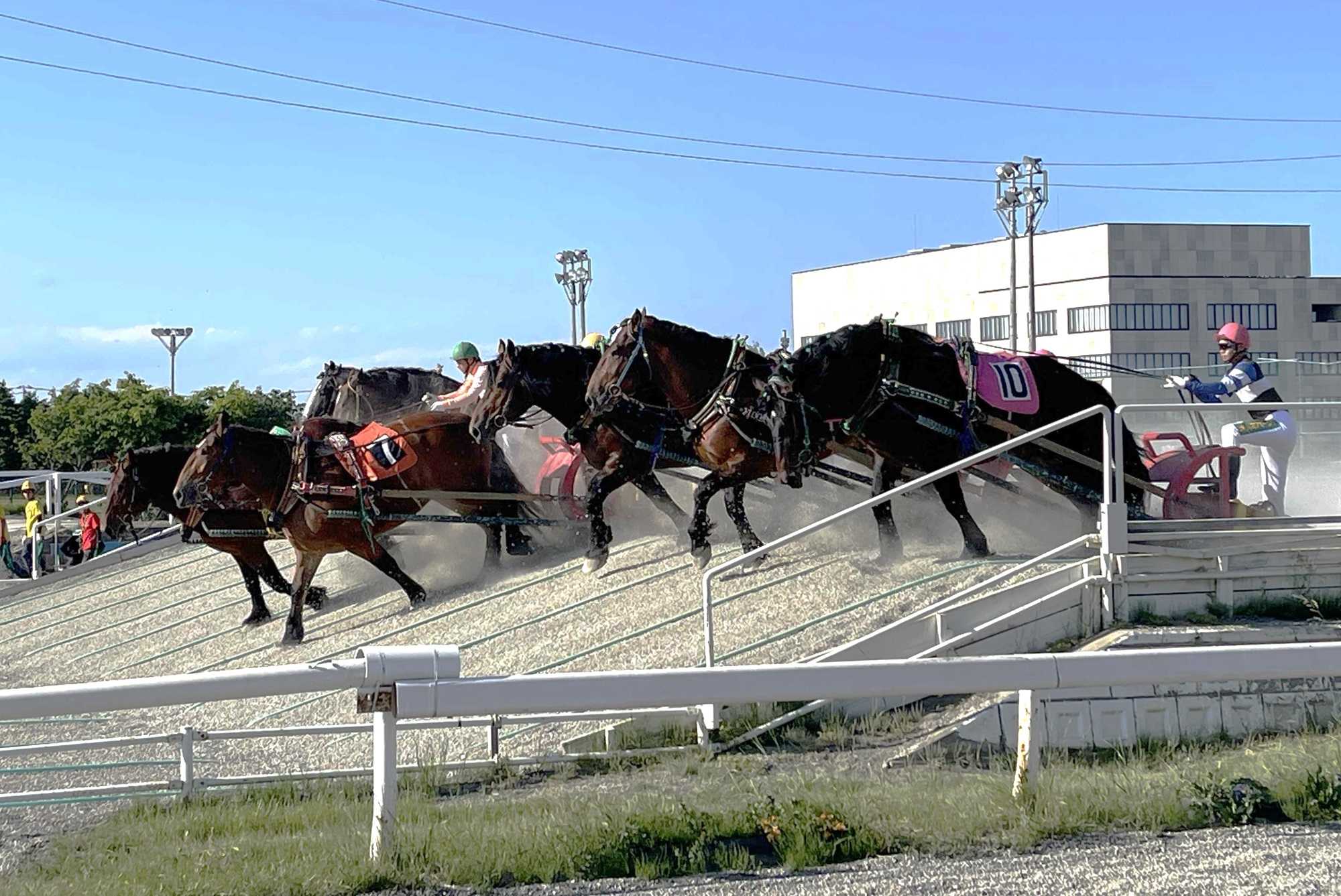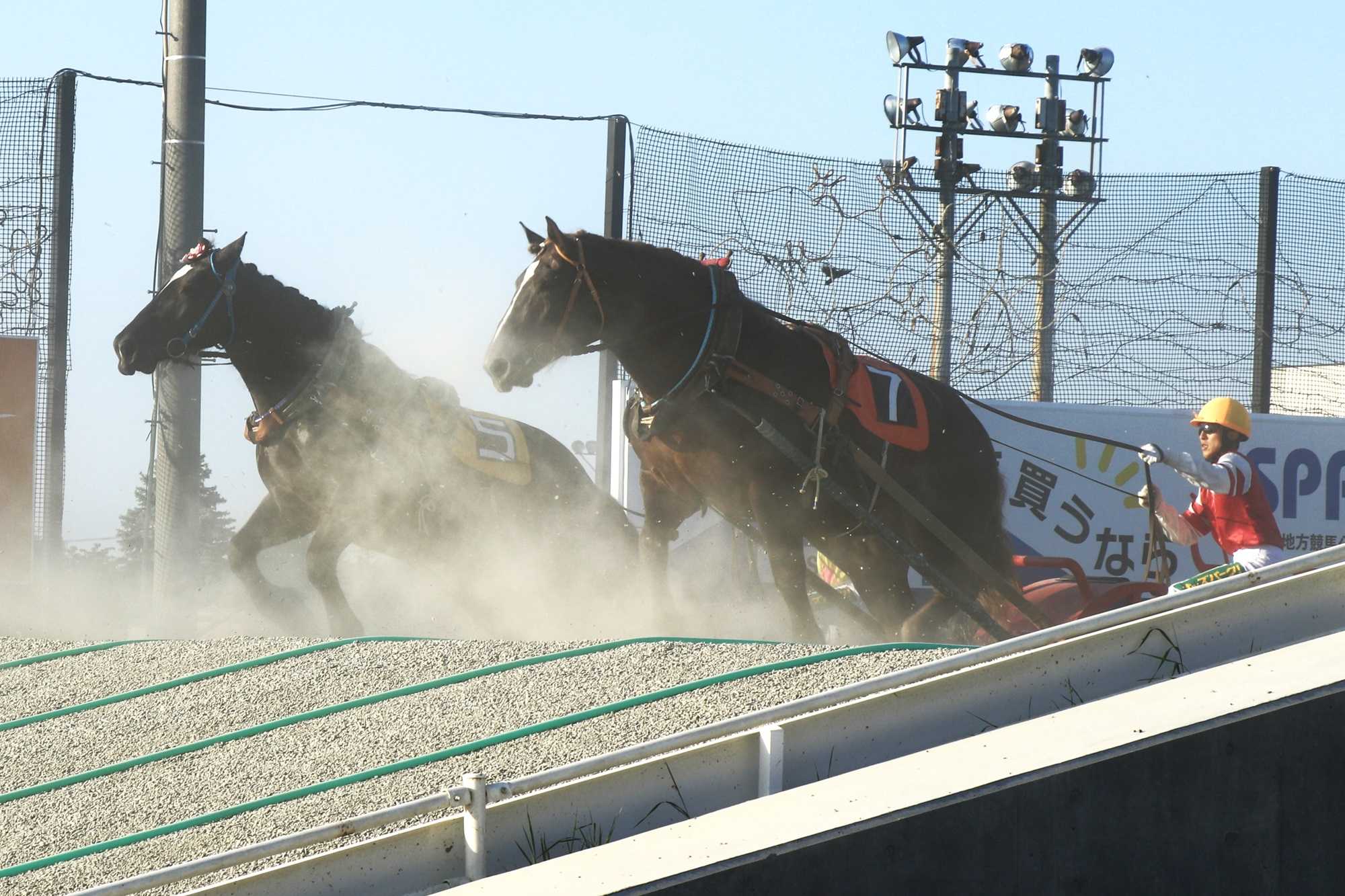 ばん馬と呼ばれる力持ちの馬が重たいソリを引くレースを