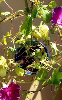 10月のベランダでまだ頑張る朝顔が3個咲きと咲いていて