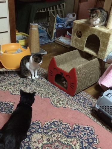 2日の月曜日すっかり室内を点検した楽ちゃん(ちょっと名前悩んでます)はタワーの下に置いたバラのベッドを定位置に決めたようです。常にここからスタートして行動を起こします#おしゃかなうまいぃ~##あ、黒いおにいしゃん、こんにちは#「シャー。至近距離の挨拶は100年早いでしゅよ」#ごめんなしゃい。早くお顔を覚えてほしいでしゅよ##・・・って、ちょっと待てちょっと待てお兄しゃん。あたちのご飯でしゅ# 「子供にはおかかは毒でしゅよ。おりぇが食べといてあげるでしゅ」#おばしゃん、おかかは毒でしゅか?#そ、そうね。常習性があると言えばあるので毒とも言うわねじゃ、ちょっと運動しましょうか#お、おばしゃん、これ何でしゅか?すごく楽しそうでしゅ#カシャカシャ・・・カシャカシャ#ぅううううううううううううううう。面白しょうでしゅすると、この音に誘われてケージで固まっていた二葉ちゃんが出てきました二葉ちゃんも参戦したい勢いでも、食器棚の上で黒いおにいさん(同じ歳ですけど)とお姉さまが睨んでますとうとう好奇心が抑えられない(楽ちゃん)が参戦もう、面白くてやめられませんそこに元祖好奇心のラっちゃんまで2にゃんは電池が切れるまで遊んだのでした二葉ちゃんも外に出てみたら止まらない好奇心$こんにちは。あたち二葉でしゅ$$あ、これ楽ちゃんが悪戯してたものでしゅね。何が入ってるでしゅか$$今度のお家はごちゃごちゃしてましゅね。でも、面白いかもでしゅ$あ、それはどうもじゃ、おばしゃんはお昼ご飯を食べてくるわねお昼は伊那で買ってきた「高遠そば」焦がしたお味噌に大根おろし(辛めの物)を汁ごと入れて、刻みねぎを入れて軽くお水を入れたおつゆで食べるそうですお味噌が好きなので気に入りましたただ、お味噌と大根おろしでおそば本来の香りは分かりずらいかな^^楽ちゃんの名前ですがまるっと猫さんが照れてしまうと言うことで思案中です楽=リラックスのリラ愛と平和の象徴のパワーストーンである、ラリマーが候補です。呼ぶ時はリマになっちゃうかな私のお花の看板名「凛秋」からとって凛々(りり)あはは。みんな日本人の発音苦手なrですねもうちょっと考えます2日ですがみんなとご飯を食べる楽ちゃんなのでした