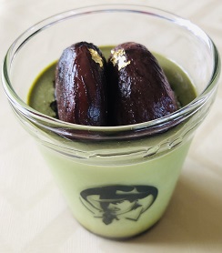 抹茶のプリンの大きな栗。そして金箔
