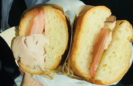 フランスパンに鶏むね肉、パストラミ、チーズがはさんであり、バジルソースでした