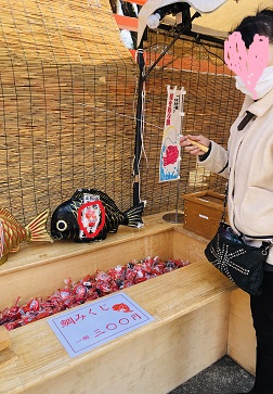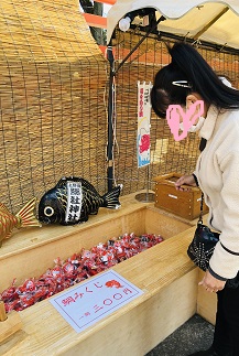最初に釣ったおみくじがくっついていて、上手く開けず、やり直していいとのことで、再チャレしたら