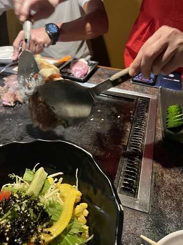 アンガス牛×2 豚ステーキ×2 お好み焼き もんじゃ焼き きゅうりの漬物 サラダ