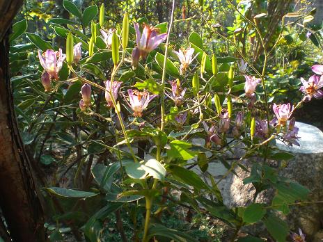 ホトトギスが咲き乱れています。若々しいという印象の花ではないけれど、無いと寂しい、そんな感じです。みんな上を向いて咲くのよね。 鳥のホトトギスの胸の模様と同じことからきた命名です。本当ですね。なんだか不思議。自然界の色んな模様、水玉があれば、面白いですね。 お出かけが忙しくなる季節、と同時に仕事も忙しくなります。今朝は、ゴミ出しから帰ってきたら、八時にすでにお客さんが待っていました。そのあと、一人が来て、今また、これから行きます、と違う人から、電話がありました。有難いことですね~ 昨日、暗くなってから来たお客さんは、友人の娘さん。まだ新婚さんです。玄関で、娘さんと話している間に、車が方向転換している様子。ご主人? はい、そうです~、とニッコリ。勤め先がいっしょで、行きも帰りもいっしょですって。あら、いいんだ、いいんだ~♪♪と、おばさん丸出しのつっこみを入れて冷やかします。お幸せにね~、と思います。こちらは、じっとしていて、お客さんが来てくださる、本当に有難いと思います。お金なんかは本当に内職程度の微々たるものなんですよ~幸せなのは、退屈しないこと、喜んでもらえること、生活にリズムがあること、です。 ブログランキングに参加しています応援のクリックをよろしくお願いします。
