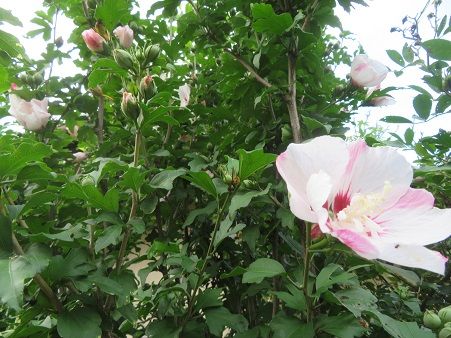 木槿(ムクゲ)の花。一日花です。朝咲いては、夕方には萎んでしまいます。「槿花一日の栄」。変わりやすいこと、儚いことに例えられます。そういえば、シャラの花も一日花ですね。木陰には、ヤブコウジの群れ。どうしたことでしょうか、今年は。全てのヤブコウジが、びっしりと花を付けています。ヤブコウジが大好きで、地面を覆うように、咲いてくれればいいな、と思っていました。今年は、その通りになり、嬉しいのですが、増えすぎていて、決めた範囲から、はみ出して咲いているのは、抜く作業をしました。このあたりは、クリスマスローズもいるので、色んな根が絡まり過ぎても困ると思ったので。大きな樹木のシャラやムクゲ、その木陰に守られ、20cmほどのヤブコウジ、助け合っているな、と思いました。ご近所さんから、茄子、キュウリ、ピーマンを頂きました。私も、助けられて生きています。午前中、関西の友人と長電話。終わったら、 1時間10分が経過していました。アハハ、よくそんなに喋れるよね、女性は。人との会話は、心が明るくなります。友人にも助けられて生きています。 花ブログランキンに参加しています。 応援のクリックをよろしくお願いします。 昨日のアクセス数 1798 昨日のランキング順 6 位