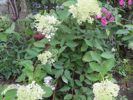 ノリウツギです。普通のアジサイが終わりかけの頃、咲き始めます。ナチュラルで、いいですね~。ピラミッド型に、綺麗にまとまっています。茎が長くて、花の重さもあり、雨で、全部が枝垂れています。もちろん、ちゃんと剪定していないせいもあります。今年は、ちゃんと剪定してみましょう。奥は、ピンクのフロックス。もうこれも終わっていきますね。ブラックベリーは、毎日、20個ずつくらい、黒くなったものから収穫していきます。昨日は、雨で収穫しなかったので、二日分です。冷凍庫がブラックベリーでいっぱいで、場所塞ぎです。イチゴのように、生食が美味しいのなら、皆さんに、どんどんあげるのだけれど、そんなに美味しいものでは無いし、やっぱりジャムか~。M子さんが、雨に濡れた採れたてキュウリを、届けてくれました。「ブラックベリー要る?」と聞いたら、「種がいっぱいあるから要らない」と、断られ、ジャムが出来たら欲しい」ですって。ハイハイ、と言いながら二人で大笑いです。やっぱり生食は人気が無いな~。私は、ヨーグルトと一緒に五個くらい毎朝食べてます。栄養あるんだけれどなあ。 花ブログランキンに参加しています。 応援のクリックをよろしくお願いします。 昨日のアクセス数 2970 昨日のランキング順 6 位