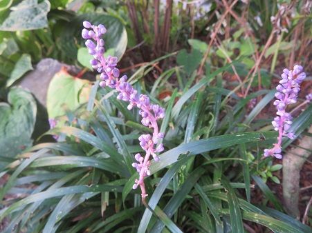 ヤブランが、形は悪いですが、いつの間にか咲いています。もっとしゅっとまっすぐ伸びる筈なのに。斑入りヤブランも穂を出しています。みんな暑さに負けず、ガンバレ~。似たような葉ですが、色は青黒く、実はツヤツヤと真っ黒。コクリュウです。そういえば、実がなるということは、花が咲いた筈、いつ咲いたかなあ~。今日は、長男が友人と一緒に来てくれました。検査を受けて、陰性なので、安心して、とのこと。気を使ってくれて、有難いです。丁度お昼時なので、そうめんでもと思い、前日の夜に聞いてみたら、一時間ほどしかいないので、麦茶だけでいい、との返事。麦茶だけ、も寂しいので、またまた、ブルーベリーを50粒も入れて、パウンドケーキを焼きました。いっぱい入れたブルーベリーが、下の方に沈んでしまい、いつにないミニ失敗。冷たい紅茶と、パウンドケーキと、紫蘇ジュースのゼリー、生クリーム掛け。始めてきた人の前で、自分のお出ししたものを、写真を撮るのも恥ずかしいのですが、丁度主人のお仏壇に、お線香を上げに行ったので、その間に、さっと撮りました。(笑)美味しいと食べてくれて良かったです。お土産をいっぱい頂きました。鳩サブレとわらび餅の詰め合わせ。ハンドスチーマー、仕事に役立つかも、と思ってくれたようです。可愛いデザインで、早く使ってみたいです。ポストカード。絵が素敵なので、飾ってもいいかなと思います。あと、お仏壇用の線香も貰いました。行くところが三、四か所あり、一時間でお別れ。この猛暑の中、検査までして、来てくれただけで嬉しいです。有難う。 花ブログランキンに参加しています。 応援のクリックをよろしくお願いします。 昨日のアクセス数 1264 昨日のランキング順 7 位