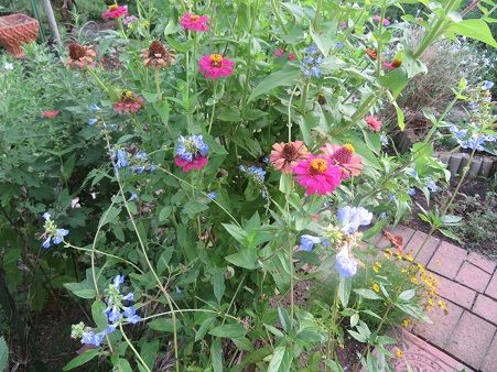 ボックセージが咲いています。爽やかな空色が、百日草に混じっています。夏は、花が少なくなる中で、百日草は百日咲いてくれるし、とても貴重です。ダールベルクデージーも、花期が長いですね。ほとんど一年中咲いている感じがします。息子が帰省するので、食料を買い込みました。一週間滞在するそうで、その間、どこにも出ず、閉じこもる積りなので、足りないものがあっても、あるものだけを工夫して暮らすつもりです。話し合って決めました。冷凍庫のブラックベリーがかさばって、食料を入れようにも、満杯です。忙しい日に、作るのはイヤなのですが、ジャムを作ることにしました。7ビン、けっこうな数が出来ました。ブラックベリーは細かい種があるので、ザルで漉して、口当たりよく作りました。何とも言えない美しい紅色のジャムです。数々いろんな種類のジャム作りをしましたが、ブラックべりジャムは、コクがあって、一番美味しいと、私は思っています。夕方、野菜を頂きました。ありがたや。息子のための野菜料理を作りたいな。 花ブログランキンに参加しています。 応援のクリックをよろしくお願いします。 昨日のアクセス数 2828 昨日のランキング順 6 位