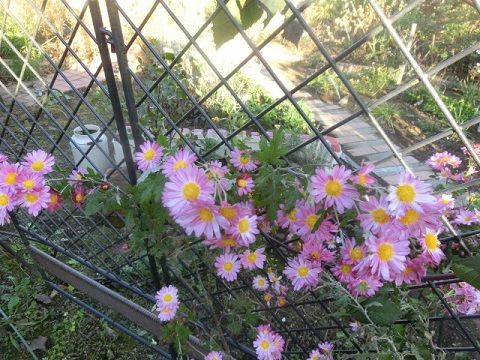 ブラックベリーの絡んでいるフェンスに、一緒に咲いているピンクの小菊です。一枝で、小さな花束のようです。抜けるような真っ青な空に、オレンジ色の柿が綺麗です。今年は、柿が豊作で、あまり果物を食べない私ですが、昔から医者いらずといわれるほどの栄養があるので、一日二ケを、頑張って食べています。今日は、枝の高いところになっていて、最後まで残っている柿を収穫しました。声をかけては、欲しいという方には、差し上げています。田舎だから、どこかから頂くことが多いので、誰もいらないのだろうな、と遠慮しながら声をかけるのですが、たいていの人が、喜んで貰ってくれます。さて、今日は、だれに差し上げましょうか。しばらく顔を見ていないNさんに電話してみました。風邪ではないのだけれど、頭が痛くて、体がだるくて、三日間寝込んでいると言います。柿、要る?欲しい、大好きよ。でも、取りに行けない、と、そんな会話のあと、玄関先に、袋に入れて置いておくので、中に入れてね、柿を食べて、早く元気になってね、と返事。さっき、車で10分ほどなので、届けてきました。食べれたらいいな。庭のありったけの種類の小菊を、活けてみました。プレバト査定で、最下位がつきそうな、めちゃくちゃに、ただ突っ込んだだけの生け花です。でも、香りがして、綺麗です。 花ブログランキングに参加しています。 応援のクリックをよろしくお願いします。 昨日のアクセス数 1295 昨日のランキング 1 位