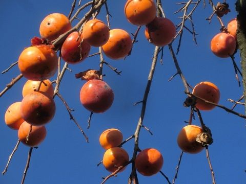 抜けるような真っ青な空に、オレンジ色の柿が綺麗です。