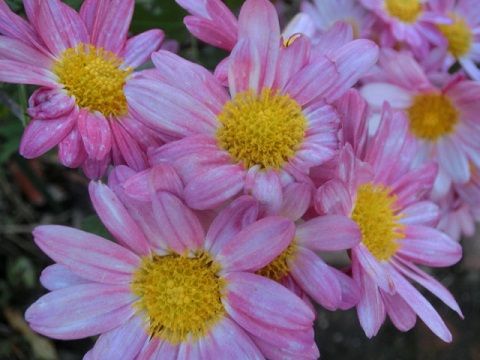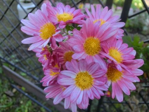 ​​​​​​​ブラックベリーの絡んでいるフェンスに、一緒に咲いているピンクの小菊です。
