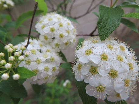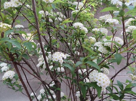 ミヤコワスレの奥では、コデマリが満開。