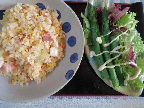 庭でアスパラ三本収穫、サニーレタスも。