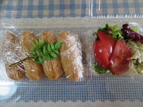 お稲荷さんとサラダとキャベツ甘酢漬け。