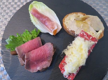 スレートのお皿に乗った前菜、