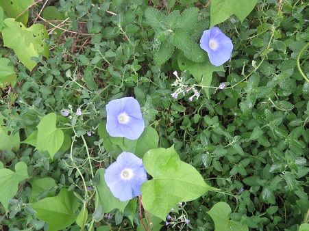 零れた種からの朝顔が、縦横無尽に、