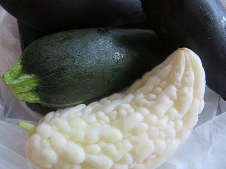 茄子、ズッキーニ、白ゴーヤを頂く。