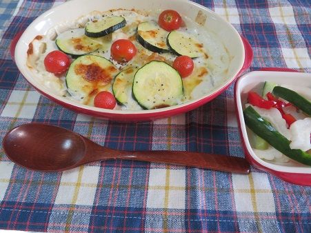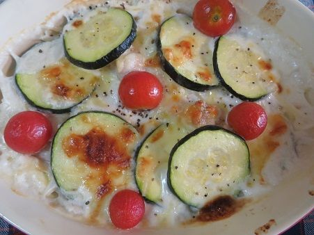 ズッキーニ、鶏肉、ミニトマトのグラタン。