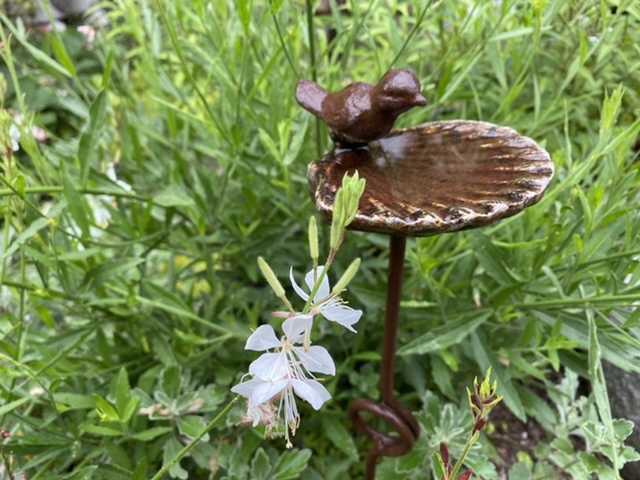 ガウラの花の中で、水飲むアイアンの小鳥。