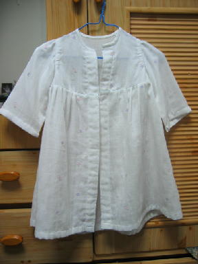 連休中は、ひたすらグウタラお裁縫に励んでました。色々と完成させましたよ~。まずは、放置してたおめかしドレスとツーウェイドレスに頑張ってボタンを付け、よだれかけを大量生産して、おくるみをもう1枚作ろうとバイアスを付け、縁かがりを放置!ツーウェイドレスの余り布でロンパースを作り、例のごとくボタン付けは放置♪ミシンを出し入れするのが面倒なんで、一度に色んな物をまとめて縫ってるから、どれを先に完成させるか迷ってしまってます。(^_^;)でも、まずは完成させたものを紹介しなくちゃね。 このドレスが、こうなりました・・・じゃかじゃん! ちゃんとゴムを通して、ボタンも頑張ってつけました。 あまりにも飾りっけがなかったんで、バラの蕾のリボンでアクセント。あと、お揃いの布でボンネットなんぞも作ってみました。いかが?