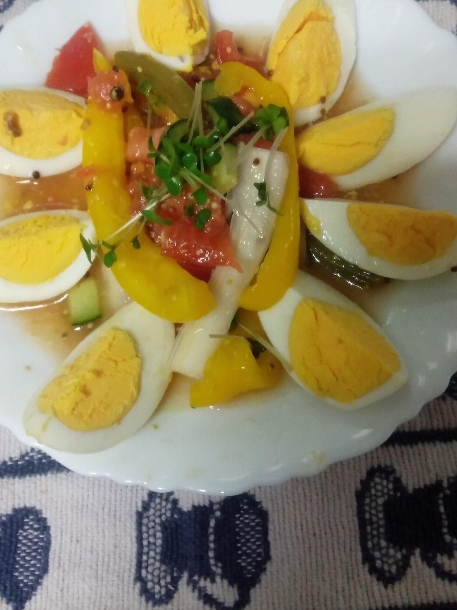 作り置き!卵と野菜のラビゴットマリネ作者: 満天112■材料(4人分)セロリ / 白い部分1本分きゅうり / 1/2本トマト / 1/2個玉ねぎ / 1/2個インゲン / 6本黄パプリカ / 1/2個卵 / 4個酢 / 1カップエクストラバージンオリーブオイル / 1カップ塩 / 小さじ2砂糖 / 大さじ1粒マスタード / 大さじ1ブラックペッパー / 少々ブロコリースプラウト / 適宜■レシピを考えた人のコメント冷蔵庫の常備菜として、夏にさっぱりいただけるマリネ。見た目も華やかなので、おもてなしの前菜にさっと出せる一品です。野菜は何でもOK。詳細を楽天レシピで見る→━━━━━━━━━━━━━━━━━━…↓↓ ポイントが貯まるレシピ サイト ↓↓>>最短約 30 秒!▼無料▼会員登録<<━━━━━━━━━━━━━━━━━━…暑くて火を使いたくない時に。冷蔵庫で冷やしておけば、さっと出せるべんりな1品にほんブログ村