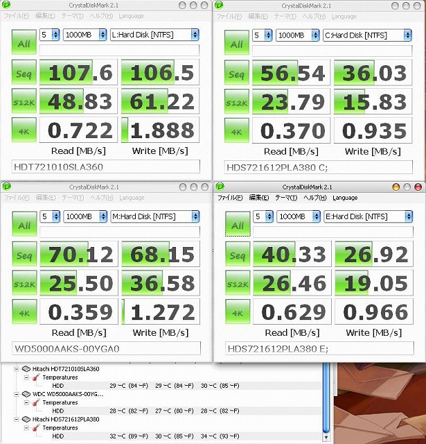 今日は昨日予告した通り、HDDを買いに秋葉原に行ってきました。ついでに、本棚の1/3を占有しそろそろ本格的にやばくなってきた同人誌を整理し、要らないものも売りに行く事に。いざまとめてみると、別に要らないと思った物が7・80冊も…流石にこれだけの量をいつものバックにしまうのは無理だったので、ここでお蔵入りしていたカートを使う事にしました。以前千葉の新しくできたプラモショップで買い物した時の福引で当てたのですが、中々使いどころが無くてもう何年もクローゼットに眠っていましたwあぁ、そういえばあの時にリュックと一緒にダイヤモンドバックスの蜂やらガイアカラーの溶剤やらを電車内に置き忘れて帰ってこなかったんだよなぁ…もうこれ以上思いだすと欝になるからやめようorzアキバについてからはすぐにK-BOOKSへ買い取りに向かいました。開店後すぐに行ったのですが、その時点でもう5・6人くらいは並んでいました。最近なんかイベントあったっけ・・・? あぁ、例大祭か。買い取り自体は待ち時間と査定時間合わせて1時間くらいで終了。数冊状態悪しで買取できなかった物を除いて、全部で4000円ちょっとでした。まぁ、地元の千葉鑑で買い叩かれるよりかはましか… と思い了承。とりあえずこの時点で電車代は浮きました。その後はHDDの価格チェックにPCパーツショップ巡り。用途と予算からして、1TBでそれなりのリード/ライト、かつできれば静穏・低発熱という要望から、日立のHDT721010SLA360をチョイス。各店舗を見た結果殆ど価格差は無かったので、ソフマップで買っておきました。この時点で目的は完遂したので、ぶらぶらと中古ゲームの価格を見たりしてからまっすぐ帰宅。帰ってからはバイトの時間までHDDのフォーマットしつつ仮眠していました。で、バイトから帰ってきて早速HDDのスコアベンチを取ってみました。ついでにOS・システム用の日立HDS721612PLA380、データ用のウェスタンデジタルWD5000AAKS-00YGA0のスコアと各HDDの温度もチェック。その結果がこちらつ圧倒的じゃないか、我が軍は!(ぁいやほんと、そのスコアには脱帽です。特にシステムドライブとの性能差が酷い凄い。512KBライトでは実に4倍近いレートです。発売年を考えればシステムドライブも決して悪い物ではないのですが、こうしてみるとやはり見劣りしてしまいますねぇ・・・お金があればIntelSSDとか導入してみたいです。 いや無理だけど。ちなみに今回買った日立HDDのお値段は7,980円。 ほんと、いい時代ですねぇ…パソコンを手に入れてからかれこれ3年ちょっと経ちますが、ストレージデバイスの進化と低価格化は凄まじい勢いです。最初の1年目に買ったMatroxの250GBが12,000円、2年目後半に買ったウェスタンデジタルの500GBが8,980円ですよ。用量は倍々になり、性能は上がり、かつ単価は下がるばかり。流石に主流品の底値は行き止まりになりましたが、これで採算は取れているのか心配になるくらいです。まぁ私達エンドユーザーにはありがたい限りですかし、できればこの流れが続いて欲しいですね。バイトで閉店後、まかないを食べつつ談笑していたときの話。ちょっと睡魔がきて目をこすっていたら、社員さんに「随分眠そうだね」と聞かれました。素直に朝からアキバまで買い物に行っていたのでーと言うと、話題に乗ってくれたのか「アキバかー、オレメイド喫茶いってみたいなーw」と。その社員さんはノリがよく、その台詞も冗談半分の話題だったんですが、そこでまさかのレジの女の子が「私もメイド喫茶行ってみたいですー」 Σ(;;;;゚ Д゚)!!?!?いやいやいや、君普通の彼氏持ちの一般人だよね?言動も趣味趣向も極々普通の娘だったよね??普段そんな片鱗など欠片も見せた事がなく、見た目も普通の美人さんだったので、その食い付きには度肝を抜かれる気分でした。てっきち気持ち悪がるかドン引きか、そんな扱いだと思っていましたからね… 逆に心臓に悪いww