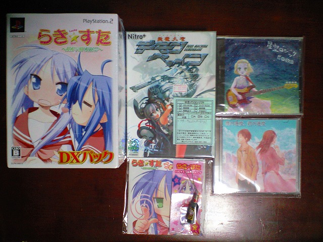 真ん中は勢いで買った。後悔はしていない(ぁとゆーわけで昨日秋葉にらきすたPS2引取りに行ってきました。午前のバイトに行ってから(ぁBLESSで17:00からタイムセールやってたらしいし、コトブキヤ閉店セールも早めに行った方がいいと思ったし、今日(日曜)1日フルで使えたほうが身が入るだろう。と判断して頑張っていってきました。んでダッシュでギリギリ特急に間に合い、4時半ごろに秋葉へ到着。ゲマでらきすた引き取り→コトブキヤチェック→BLESSチェック→とらで委託チェックの順で買い物しました。ゲマでは店員のにーちゃんがつかさコス… 悪いけど吹いたt(ryちょっと女装にはごつ過ぎた気が… いやいいんですけどね。次にコトブキヤでガレキチェック。半額でデモベorトューソード買えたらウマーと思ってたんですが、現実はそんなに甘くありませんね。粗方目ぼしい物は売り切れていましたよorzせめてモデレイトや工具関連でもないものかと思いましたが、見事にすっからかん状態。ちっ、腹いせにアルテコ掻っ攫っていこうと思ったのに(ぇ仕方ないのでスルーしてBLESSへ。こっちはこっちで大したものが無いorzまぁ私主観で、ですが。 なんかスタンプラリーもやってたな…次にとらに行って落ちた秒速音楽委員会のCDをゲット。それまで不振だった店巡りの腹いせに岸田教団の星空ロジックも買ってしまいました。…うん。確信犯(ぁそこらで用件も終わったし帰るか…といっても次の快特まで時間があったので、中古ゲーム漁りをタスクに追加。話題に出した沙耶の唄が狙い目だったんですが、どこも高いorz安くても4000円台後半とか、元の価格的にもあまり中古の意味が無く。てゆーか通販の方が安い。んで数件巡って結局、相場的にも最安値なPC版デモンベイン買ってきてしまいました(爆うん、まぁ、若気の至りだ・・・・ まったく後悔していないがn(ryそんな感じで相当ほくほくして帰宅。帰ってからはセットアップやディスクレス化などで直ぐに寝る時間になってしまいました・・・なんで今日起きてからプレイしまくり。特に通販でとどいたF.E.A.Rにはいろんな意味で虜にされた。プレイしたいのに、熱暴走で途中で落ちまくる(ぉぃやっぱりリテール外してガイド付けたエアフローじゃ無理か…と嘆きつつHWMで見てみると、GPU-(ハイフン)110℃ ( ゚д゚)ポカーンそりゃ落ちるわ… と爆音になるけど泣く泣くリテールクーラー再装着。流石につけたらちゃんと動いてくれました。しゃーない、今度Zalmanのクーラーでも買ってくるか…で、そんな事に熱中しているあいだに日曜日終了。ほんと一体なにしてたんだと(tyもち原稿は手についてません。マジでヤバイです。仕方ねー、テスト直前だけど徹夜で取り組むか…
