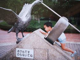 平成10年、かえでは小学校の一年生になった。小学校時代の4年生(10歳)くらいまでは、とても落ち着いていて、良い時代だった。自閉症は 『10歳まで黄金期』 と言われている(10歳の壁がある)。かえでも、ほんとにその波に乗って、いろんなことができるようになっていた。かえでが養護学校へ行っているということは、もう近所周りには隠せないことなので、この頃から私も、だいぶ前向きに考えるようになっていた。いつまでも隠しておいても仕方がない。かえでが住みよい世の中を作るには、私達親子が外へ出て行かなくてはダメなんだ。そんなふうに思うようになっていた。毎年12月に、養護学校のバザーがある。親がご近所を回って、寄付品を集めて、値段をつけて売る。私も、近所や親戚、娘の同級生の家などに回って、バザーに寄付してもらえるものを集めた。夫の実家へも行って、義母にバザーの件を話した。かえでが養護学校へ入ったことは当然知っているので、その時は快く、家にあった醤油やサラダ油、海苔、洗剤、バスタオルなど出してくれた。私が集めて回って家は、全部で100軒近くになった。養護学校の小学部の児童は、大きな松ぼっくりを使ってクリスマスツリーを作り、それを販売。とても可愛いツリーで、写真がないのが残念^_^;バザーも大盛況に終わって、寄付してくださった方にお礼状を渡すようになっている。このお礼状に、私からのお礼状もつけて、松ぼっくりのツリーを一緒に渡そうそうすれば、かえでのことを少しでも理解してもらえるかも?そう思いついて、お礼の手紙を書いた。生まれてからのかえでの様子。自閉症だとわかって、一緒に死んでしまおうと思ったこと。人に言えず、ずっと隠しておこうと思っていたけど、障害のある子を少しでも理解してもらいたいという思いから、皆さんにバザーの寄付のお願いに回ったこと。自閉症とは、こういう病気です。かえでは、言葉もあまり出ないし会話も出来ないし、ヘンな行動が多いけど、その辺であったら、どうか声を掛けてください。そんな内容のことを書いて、家で松ぼっくりのツリーを100個作り、一緒にそれを渡して回った。それまでの私と比べたら、すごい前向きな行動で、自分でもびっくりした。母は強し!ホントにそうだな、と自分で思った。かえでの話をすることは、返ってかえでを晒し者にしてるみたいで、辛い部分もあったけど、これを機会に、周りの目が変わってきた。「障害があるって聞いてたけど、どんな感じかわからなくて なんて声を掛けていいかわからなかったけど、 これからかえでくんを連れて遊びに来てね」と言ってくれた人もあった。お返事の温かい手紙をくれた人もあった。夫の実家へもツリーと手紙を持っていった。バザーが12月だったので、お正月に夫の実家へ行った時、義母の様子が違っていた。かえでを真っ先に抱き上げ、「重くなったねぇ」と頬ずりしていた。手紙を読んで、我が家の様子を少しでも理解してくれたようだった。「育て方が悪い」と言った義母。あの時の悔しい思いは、決して忘れることはないけど、汚名返上?できたことは良かったと思う。かえでは、相変わらず偏食もこだわりも強く、手こずることが多かったけど、ほとんど病気もせず、毎日元気に学校へ行ってくれて、私にもだんだんと余裕が出てきた頃だった。 乗っちゃいかんってば!