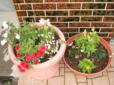 本日二度目の更新なのだ!初めて、花に関するテーマを選択してみたので、専門的な方が見たら大変恥ずかしいのですが・・・私は園芸関係のことは全くの無知で、恥ずかしながら庭の手入れもろくにしていないです。3年半前に、同居の母が亡くなりました。母はなんでも出来ちゃう人で、料理やお菓子を作ることも上手だったし、歌も上手いし、絵も描ける。園芸関係についても詳しくて、野菜作りやいろんな花も上手に育てていた。大輪の菊の花を咲かせて菊花展にも出したり、蘭もきれいに咲かせていた。しかし、母が亡くなってからは、庭は草ボーボーで、夏はジャングル冬は砂漠と化しています。これではいけない!と、3年経ってやっと手入れをする気になったのはいいけど、どうやっていいのかもわからず、とりあえず庭の片隅に放ってあったたくさんの植木鉢を使って、寄せ植えをしてみようと思いましたホームセンターで花の苗を買ってこようと、行ったはいいけど、どんなのがいいのかわからない。まあ、今の時期に売っている花なら何でもいいだろうと思い、適当に選んで買ってきましたで、植えたのがこちら↓ なんていう名前の花なのか、ポットにくっ付いていた花のラベルを見ないと解らなくて、娘に聞かれて、返事に困っている母でございます。一応、初めて寄せ植えをしたということで、勘弁してやってください