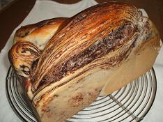 えっと、重い日記が続いたので、久々にパンの話題でも・・・折り込みシート(ショコラシート)というものを初めて購入したんです。賞味期限が短いようで、早めに作りたいと思い、2日連続で挑戦してみました。折り込み方がよくわからないので、クロワッサンを作るときみたいに、シートを包んで、冷蔵庫で生地を冷やしながら、伸ばして三つ折をして~を繰り返し、ジャ~~ン!なんか、ちょっとグロテスク?・・・これは、1.5斤の食パン型で編み込むように成型して焼きました^^チョコレートの甘くていい香りが、いっぱいに広がりますぅ切ったところ実は自分で作ってびっくりしてしまったこんなにうまくチョコの層ができるとは~!生地ももっちりふんわりしっとりで、う~~ん、美味しい~!なんか買ったのみたいだよーーーあ~~ん しあわせ上の娘は、毎朝、必ずご飯と味噌汁(和食党^^♪)なんだけど、これを見て「明日の朝、これ食べていっていい?」と言うんです^^嬉しくなってしまったわ~~そして、また今日は同じくショコラシートを使ってパン作り(って、このシートしか買ってないので^_^;)今日は、昨日と同じ生地で、半分を編み込んで成型して、パウンド型で焼いてみました。こんな感じで、二次発酵 で、焼いたら、こうなりました~ 断面もなかなかきれいでしょ?残り半分の生地は、細長く切ってウルトラC級のひねり?を。これがまるで生きているように、ひねってもひねっても、元に戻ろうとしてくる。端っこをちょっときつめに押さえつけて二次発酵! 焼き上がり~~(*^^)v 今日のパンもやわらかくて、すご~く良かった♪(自画自賛)娘には「え?またこれ?」と言われてしまったけど・・・^_^;私は、つまみ食い試食が多すぎて、お腹がいっぱいだよ・・・(T_T)紀子様が親王さまをご出産されましたね^^おめでとうございます実は、うちの下の娘がロイヤルな名前(一体どんな名前よ^m^)でして、皇室のことは、なんか他人事とは思えないような・・・皇位継承の問題もあるようですが、お誕生は素直に喜ばしいことです。私も3人を帝王切開で産んだので、紀子様も今頃は麻酔が切れて痛いだろうな~なんて思っております。でも、今日は一日中この番組ばかりで、さすがにちょっと飽きたなぁ・・・