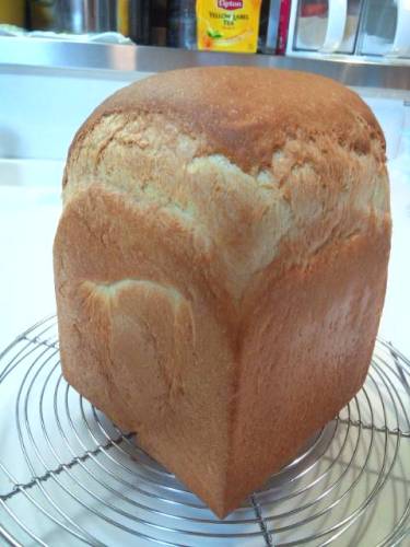 最近のコンビニは、ほんとにすごい品揃え。昨日の朝、情報番組でやってました。一人分のレトルトお惣菜の特集。手作り風の、便利なおかずがいっぱいで、街の声も、常備してます^^な人が多かった。私は、まだ買ったことないので、お昼ご飯の時にでも、利用してみようか(^_^;) そして、スィーツやパンも、次から次へと、新しいものが出てくる出てくる♪ウワサの"金の食パン"は、食べてみました。が、ちょっとパサついた感じがして、味をつけているな~と思われる甘味が、私にはイマイチだった・・というか、食パンって、もっとシンプルで、粉の甘味を感じられるのがいいな・・と思ってしまいました~~(^_^;)えらそうです。すみません~~<(_ _)> で、先日、以前お世話になっていたパン教室へ、材料を買いに行った時、私が教わった先生がいて、あれこれ話をしていたら、今日、教室で作ったばかりの食パンがあるから、少し食べてみて^^と、6枚切りくらいの厚さの縦半分にしたパンをもらいました。“金の食パン”に対抗して(真似して?)作ってみたそうで、ふんわりと、自然な甘さで、私的には、あの食パンより、これが好きだなあと思いました(^_^;)そんでもって、材料と、その配合を、簡単に教えてもらい、自分なりに作ってみました( ´艸`)お砂糖+はちみつ、スキムミルク、生クリーム、マーガリンここらへんが、いつも作る食パンとは違う部分ですね~^^ ってことで、じゃーん(笑) すごい窯伸び~~\(^o^)/嬉しいなあ。自分で焼いた食パンが、こんなふうに、ググーンと大きく焼けるのは、ほんとに嬉しい♪でも、ヅラみたい・・と、秘かに笑う私( ´艸`) 見た目は普通です。切っても普通(笑) 食べてみると・・・ああ、やわらか~~そして、ほんのり甘い~~うまいわ~~(≧∇≦)そのままのと、トーストしたもの。半分だけ焼いたら・・ああ、食パンって、焼くと縮むのね(≧∇≦) ということで、金の食パンもどき?(^_^;)うちでも作れました