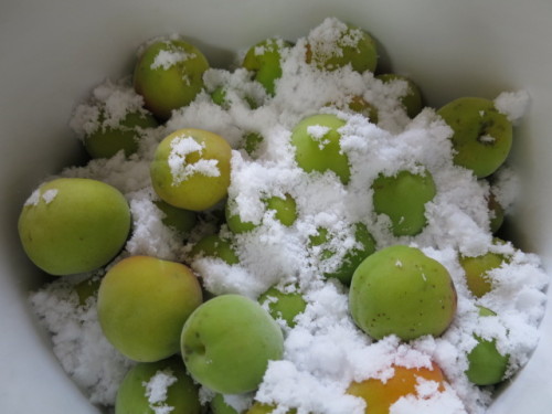 こんな陽気のせいでしょうか・・朝からダルダルしてて、どうにもやる気が起きない一日でした(^_^;)たぶん、息子の送迎を自分でやってないから・・じゃないかなと思いますが。一昨日だったか、朝、送っていこうとしたら息子がおじいちゃんの手を引っ張ってきて、私と乗るのはイヤだ!と、無言で訴えているような感じで、その日から、送迎をおじいちゃんにお願いしてるんですが、私と乗るのがイヤだ!とわかった時、すっごくガックリきました・・(;´Д`)どうも、それ以来、いろんな事に対して、私のやる気が起きなくなってしまったような?って、息子のせいにしちゃあいかんね。やる気が起きないのは、私自身の問題であって、息子を責めるのはおかしい(^_^;)そんな今日でしたが、待ったなし!の梅を漬ける仕事があるので、気合い入れて!・・って、そんなすごい仕事じゃないけど(笑)ちまちまと洗って、一個ずつ丁寧に拭いて、ヘタを取って、重さをはかって・・全部で3kgありました。去年と同様、塩分18%で漬けます。(3kg×18%=540g)ちょっとしょっぱすぎるかも?だけど、ガツンとこれくらい効いてた方がいいような気がする♪梅と塩を交互に詰めて・・重石は、梅の2倍。・・ってことは、6kg!どどーん!これで、梅酢が上がってくるまで4~5日かな。その間に、赤シソを確保しておかなくては。あとは、ほんとにやる気なしで、ダラダラさせてもらいました(^_^;)あ、花壇の草取りをやりましたね。もうー、ほんっとにすぐ草ボーボーで困ります(-_-;) それと、カメ掃除も。昨日の雨で、水がずいぶん汚れてしまったけど、きれいになって、エサを喜んで食べるカメさん(笑) ぱくぱく♪ああ、読み返したら、ほんとにやる気なさそうな私・・って感じ~~(≧∇≦)