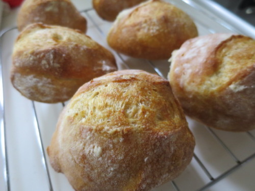 今日は・・(って昨日の日記です(^_^;))リクエストされたパンを焼く予定で、朝イチで、酵母を使って、2種類の生地を作り、ゆっくり発酵させておいて、その間に、甘い系のパンや、惣菜パンなどを焼こう・・そんな感じで計画していたんですが、お茶工場へ仕事に行っているおじいちゃん、担当のラインが動かないらしく、急きょ、休みになったそうで、「今からお茶刈りやるぞ」うわ~~~・・今日はやらないっていうから、パンのお仕事に専念しようと思ったのに。こりゃ困ったぞ(@_@;)もう、酵母のパン生地を仕込んじゃったし。 でも、お茶だって待ったナシだから、なんとかいい方法を考えないと・・とりあえず、発酵させている間(午前中)なら、なんとかなるかも?というわけで、息子が施設へ行ったあとすぐに、大急ぎでお茶刈り~~お天気もよくて、暑い暑いヘロヘロになって帰宅。さあ、ここからが大変。酵母のパンと、普通にドライイーストで焼くパンを並行して、頭の中、ゴチャゴチャになりながらも、なんとか無事に全部が焼けました\(^o^)/ ハード系のパン、リュスティック。 ワインやチーズと一緒に食べるパンが欲しい・・とのことで、ヴァン・ド・ルヴァン・・カッコいい名前(笑)赤ワインだけでこねたパン。クルミを入れました。ちょっと酸味があって、なかなかいい感じ♪その他、メロンパンと、シュガーバター。 惣菜系は、いつものハムマヨと、ベーコンチーズパン。(画像撮り忘れ) そんな感じで、夕方、急いでお届け~~~ああ、疲れた・・この時期、お茶仕事は不意打ちでやってくるので、あんまり予定が立てられないのが困るのです。逆に、テンションあげて、「さあ頑張ろう!」と思っていると、雨でできなくなったり・・(^_^;)それでも今日のパンは、無事にできて、特に、久々の自家製酵母のパンがうまくできて、喜んでいただけたし、私もすごく満足♪疲れも吹き飛んじゃいますね~^^ いや、体の疲れは、吹き飛ばないぞー(笑)歳だねえ(;´Д`)
