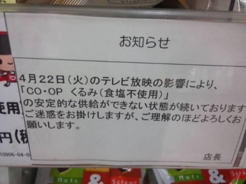 ディエス・イレ・・・とは、ラテン語で『怒りの日』。レクイエムの中の、あのロト部長の曲が、「ディエス・イレ 怒りの日」です(笑)いや、笑ってる場合ではないのだ!そう、私は今日、「怒りの日」なのだー!! スーパーでクルミを買おうと思っていくと、ここ最近、どこでも売り切れている。クルミは、主にアメリカ産が多いので、輸入の関係で入ってこないのかな?と思っていました。家に在庫があったので、2~3回分は足りていたんですが、こないだ、メイプルクルミのミニカンパーニュで、在庫を使いはたしました。いつでも大好きなクルミパンが作れるようにと、いつも2袋くらいは、買い置きしてるんだけど・・クルミパンのリクエストをいただいたので、いくらなんでも、今日はもう入荷してるだろうと思って行ってみると、やっぱりない。3軒くらい回りましたが、珍味やナッツのコーナーにはもちろん、製菓材料コーナーのクルミもない・・なんなんでしょう・・すると、最後に行ったコープに、こんな貼り紙が・・(o ̄∇ ̄)o!!ガーン あぅ~~~(;´Д`)ノまたこれかよ~~~クルミはビタミンEとかが豊富で、不飽和脂肪酸が多く、老化防止とか、血液のなんちゃらとか、とにかく体にすごくいい・・というのは、もうずっと前から普通に言われていることであって・・こうやって、急に買いだめするの、やめてくんない~~?というわけで、メイプルさん、怒ってますぅ!プンプン ディーエース イッレ!!!ディーエース イッラ!!!