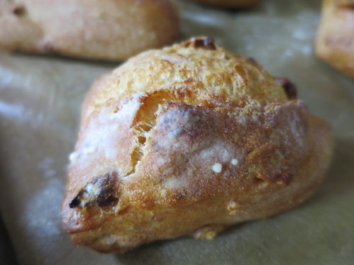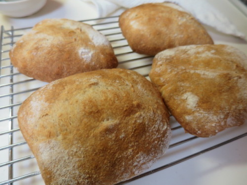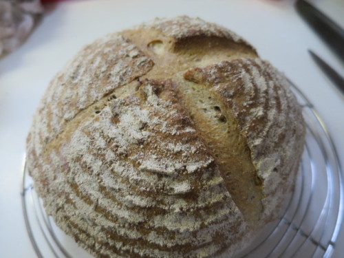 少しだけ残っていたレーズン酵母のエキスで、少しだけ中種を起こしてあったので、それを使っちゃおう♪と思って、昨日のお茶仕事が終わってから(午後3時すぎ)、生地を仕込んでおきました^^「自家製酵母で作るワンランク上のハード系パン」って本のレシピから、すごいやわらかな生地のリュスティックを。こんなに水分が多くて大丈夫かな?と思うんだけど、これでうまく発酵できれば、気泡がポコポコ入った美味しいパンができるはず。いつも作っている自家製酵母のパンは、とにかく発酵がゆっくりなので、のんびり作るにはもってこいではあるけど、それでも、仕込んでから8~9時間あれば焼き上がるもんだから、昨日もそのつもりで、夜11時頃、遅くても0時にはできるだろうと思っていました。しかーし!よくよくレシピを読んでみると・・(すごい字が小さい本なのよー)一次発酵の途中でパンチを入れて2時間置く。ボールの半分まで膨らんだら、さらにまたパンチを入れて2時間置く。そんなのが2回もあって、ボールの3分の2まで膨らんだら冷蔵庫で1時間、生地を冷やして・・あぁぁ・・なんてパンだ!というわけで、普段よりえらい時間がかかるパンだということが判明。ざっと計算しても、焼き上がりは、夜中の3時くらいになりそう(;´Д`)ってことは、12時間もかかるパンってことですね。もう、生地を仕込んでから気がついたので、放って寝るわけにもいかず、てか、酵母って生きてるし、大事に育てたのをダメにしたくないし、しょーがない!3時まで付き合ってやるよっ発酵の途中で、ソファにゴロゴロしながらテレビを見たりして、お茶仕事で疲れてて、すぐにウトウトしちゃうと、タイマーに起こされて・・を繰り返して(笑)なんとか焼きあがり~~(^_^;)やわらかい生地がダレちゃうもんだから、あんまり高さが出なくて残念だったけど、いい感じに焼けました。ちょうど3時でした(≧∇≦) 今朝、カットしてみたら・・わああ!ほんとに気泡ポコポコシンプルに粉の味が伝わってきました。手間ひまかけた分、応えてくれる感じがうれしいです(*´▽`*)以前は、こういうパンはあんまり好きじゃなかったけど、今は大好きになりました( ̄¬ ̄*) 次に作る時は、朝のうちに仕込もう。そんなわけで、今日は寝不足でぇす