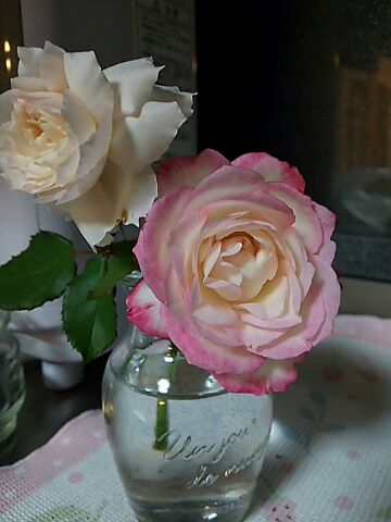 やっと・・やっと!お日様が出てきてくれましたちょっと蒸し暑いですが、やっぱり晴れるのはうれしいね♪でも、急に気温が上がったせいか、バラさんたち、クタ~っとなってます(^_^;)私もちょっと、クタ~・・ですが。 昨日の土曜日、ヘルパーさんと私と息子の3人でお出掛け(ウォーキングなど)だったんですが、雨になってしまったので、急きょ、ボウリングへ行くことに・・しかし、いつものボウリング場は、大会があって貸し切り・・一般の人は使えない状態(>_<)しかたなく、隣市のボウリング場へ。息子、混乱するかな?と心配だったけど、いつもどおりに1ゲームやることができて、てか、ヘルパーさん(女性)ってば、「私、もうずいぶんとやってなくて、100も行かないくらいなんですぅ」と言うので、「あ、私も100行けばいい方なんで、大丈夫ですよ^^」なんて笑って話していたんですが、な・・なんと、最初からストライク連発!(o ̄∇ ̄)o!!ガーンあり得ないスコアで、おぬし、正体を現しよったな!って感じでした(笑)ま、ボウリングも楽しくできて、息子のお楽しみ、レストランでランチ。その後、トランポリンへ行って、たくさん運動して帰宅。盛りだくさんの一日になりました。なんだかんだと、一日中雨だったので、朝は仕事に行った夫も、私たちが帰宅した時はもう家に帰ってきていました。私、こういうお出掛けって、ものすごく疲れちゃうんです。息子がいつ向かってくるかもわからないんで、いつもハラハラしながらヘルパーさんに付き添ってもらっているんだけど、息子の様子を見ながらも、やはり、どうしてもヘルパーさんにも気を遣うし、おまけに雨で、車の乗り降りも苦痛だし、そのたびに息子が自傷してしまうので(パターンになってる)いろいろと神経遣ってクタクタ・・で、やっと帰ってこれたところで、息子が急に向かってきたりして、ひゃ~~~!ってなっているのに、夫は知らん顔で、ヘルパーさんも困ってしまい・・そんないろんなことがあって、腹が立つやら何やらで、もうなんていうか、とにかく疲れました・・(;´ρ`) グッタリそれでもね、今日は晴れてくれたので、スカッとはいかないけど、元気出してがんばろう!って気持ちになれましたよ~\(^o^)/ありがたや、お日様。新入りのバラちゃんたちが、少しずつ咲いてます。まあ、蕾がいっぱいある状態で来たので、咲いて当たり前なんだけどさ(^_^;)ジュビレプリンスドゥモナコ。花びらのフチがうっすらと赤くなっているんです。とってもかわいい(*´▽`*)エウリディーチェ♪これまた香りがいいのよ~クンクン雨の間に咲いていたのをカットして・・(豆苗とコラボ(笑))今月初めに剪定したバラちゃんたちは、新芽をどんどん伸ばしていて、これを見ると、春先とはまた違ったうれしさが・・(*´▽`*)明日は薬剤散布してあげよう。そうそう^^こないだ娘が、また私の二の腕をさわりながら(笑)「コンビニで売ってるスィーツで、 この感触にそっくりなのがある」と言っていまして・・それを買ってきてくれました(^_^;)『ふわとろてぃらみすわらび』だったかな。なんかすごくやわらかくて、もちもちプニプニしていて(笑)手で持って食べられないので、フォークでいただきました♪うーん、こんなすごいものを腕に付けている私って、すごい( ̄∇ ̄;)甘いものって、基本、美味しいなと感じます^^娘よ、ありがと!