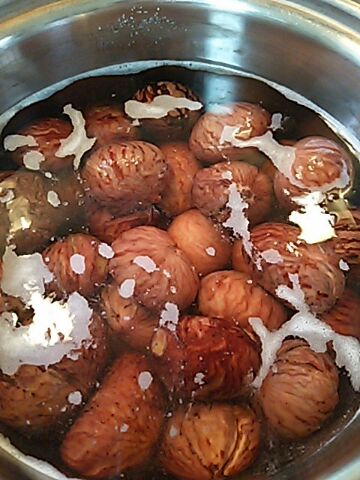 今年の栗は、いつもより早く採れることは少し前に書いたんですが・・こちらの都合も関係なく、夫は、採れた(拾った)栗をどっさりと持ち帰ってくるので、さて、これをどうしたらいいものか・・と悩みます。栗をどうにかするのは、けっこう手間ヒマかかるし、生栗は、そのまま置いておくと かびてしまうし・・そんなわけで、とりあえず冷蔵庫に入れておき、やっと昨日、栗の渋皮煮を作ることができました(;^_^A昨日は、息子がショートステイ。娘は、友達のところのお祭りに行っていて留守。おじいちゃんは敬老会。夫は仕事。こんなステキな日って滅多にないのよ~\(^o^)/その前の日は、あちこちお出掛けして充実の日曜日を過ごせたので、月曜日(祝)は、ひとり静かに、栗仕事をすることにしました( ´艸`)まずは、鬼皮を剥くところから・・これがけっこう大変。大粒の栗、30個くらい(1kg)あります。マジで疲れました(^_^;)今日は肩とか首が痛いです。剥き終わると、手もガチガチしてしまい、指先がしびれたようになって、一日たってもまだ変です。恐るべし鬼皮!てか、渋皮を傷つけないように剥くので、それが大変なのです。渋皮がついた栗、重層を入れて茹でると、すっごいアクが出るので、お湯が真っ黒になります。これをこぼして、一個ずつ丁寧に表面をきれいに洗って、筋に入り込んでいるのを竹串などで取り除きます。それを3~4回繰り返して・・って、その間、どんどん栗がやわらかくなっていくので、渋皮が破れないように、傷つけないように、そーっとそーっと・・なかなか根気がいるので、よほど時間と気持ちに余裕がないと、私には無理。最近はイライラすることが多いもんだから、夫が テーブルに ドサッと栗が入った袋を置いた時、こめかみがピキピキしまくりでしたが、やれる日があってよかった~(^_^;)きれいになったら、お砂糖を入れて静かに煮ます。破れて脱落していった栗は5個くらいだったので、かなりたくさんの渋皮煮ができましたよ~~\(^o^)/ほっこりまろやかしかし、最後にシロップを煮詰めすぎて、保存用に瓶詰めをする時、シロップが足りなくなってしまい(笑)むき出しになった栗は、娘の弁当のデザートになりました(≧∇≦)さてさて、この時間、台風16号 ひどくなってきました。まもなく通過しそうです・・サーッと過ぎ去ってくれーーー!
