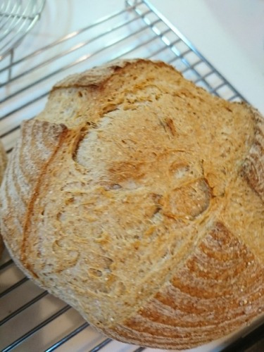 今年初めて焼くパンは、自家製酵母のカンパーニュでしたてか、パンを焼くこと自体、久しぶり(^_^;)思いっきりふたつ同時に焼きました。どーん!もうひとつ、どどーん!どちらも、いい感じにク―プが開いてくれてメリメリした感じがすごく好き~~\(^o^)/ひとつは、友達のところへお嫁入りしました。ご家族皆さんで食べてくれたそうで、パンに群がっているところを撮った写真が送られてきて笑えたけど、うれしかった~( ´艸`)そんでもって、次の日も続けてカンパーニュ。今度はココアを入れた生地に、ナッツ、ドライフルーツ、酸味があるチョコなどをどっさり入れたショコラカンパーニュ。1単位の生地を3分割して、ちょっと小ぶりちゃんなパンです。これもお嫁入り。焼いていると、家中がチョコの匂いになります(≧∇≦)これも2単位分作ったので、残りはおうち用。カットすると・・ピスタチオのグリーンと、クランベリーの赤がきれい。糖分は少ないし、甘味が少ないチョコを使っているので甘そうで甘くないショコラカンパーニュでした。これ、私が一番好きなパンだよ~( ̄¬ ̄*)そんな感じで、初焼きができました♪また若いママさんたちから、メイプルパン教室(笑)のリクエストがあったので、来月あたりにやってみようと思います。今年も 美味しいパン、たくさん作れるといいな。***********年末に復活してきたシクラメン・・蕾がたくさん出てきていたので、これを大事に育てていますが、この蕾が開いてきて、少し賑やかになってきました(*´▽`*)日当たりがいい場所が好きなんだな~というのがよくわかります。我が家の縁側の暖かい場所には、このシクラメンのほかに、息子の通所施設の園芸ボランティアで預かっているお花たちがここで冬越しをするために、所狭しと並んでいるのですが、枯らしてはいけないと神経遣っているわりに、うっかり忘れてしまうので(笑)かなり危ないです。ああ、早く暖かくなってほしいなあ・・(;^_^A