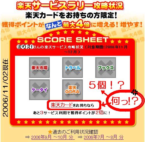 ■対象サービスが5に減った!■今日は楽天での買物を楽しんでる方への衝撃情報です~!ついこの間、対象サービスが8サービスになって喜んでたのに!私は別ページで楽天ポイント攻略のページ作ってたのに、また書き直さないといけないじゃん~!まだ書き直してないです→私の「楽天ポイント攻略」のページこの日記をリンクさせるしかないか・・・・・。時間ないのに、もう~。なんて、ノンキなこと言ってる場合じゃないんです。対象サービスも8→5に減ってしまったし!必然的に、最高に頑張っても、ポイントが4倍にしかならないです!8ジャンルあれば、どれかだめでも7or6ジャンル~ってかんじだったのに・・・・。それだけじゃない!!!!!http://ponkan.point.rakuten.co.jp/doc/rule.html 楽天の中の「新ポンカンキャンペーン ルール」こんなになってしまったのです! ↓■楽天カード会員だけ!?■対象者ってのが、ひどい!楽天カード会員だけだそうです!楽天カード会員になるのは無理です、私。なんで、そんな酷い事するの?三木谷社長~!!!!JCBカードのポイントもついでに貯まって助かってたよ~。いいじゃん、そのくらい~・・・・・。楽天カード会員なら、他のカードで買物してもいいの?確認のメールをしてくださっったけとけと。さんに感謝です。けとけと。さんの2006/11/01の日記「楽天のやり方が汚くなった(--メ」けとけと。さんの2006/11/01のもう1つの日記「楽天から返事がきた。」で、楽天からの回答を載せてくださってます。けとけと。さんの労を労いつつ、リンク&トラバさせていただきました。■儲けると、もっともっととなるの?■三木谷社長、儲かってるんでしょう?まだ足りないの?大企業は、社長というのは、限界無く、儲けたいと思ってしまうの?世の中に還元するとか、足りなくて困ってるところに回してあげようってならないの?10月のポンカンまでは、本当に買物し甲斐がありました!楽天大好き!でした。楽天カード作ってないけど、ごめんね、でした。企業という形になると利益を追い求めるばかりになてしまうの?悲しいです~!■幸せだった楽天との蜜月■去年の暮れに携帯の機種変したおかげで、ケータイもクリアできるようになってました。2ヶ月の間に兎に角クリア!を目指してました!だから、他のネットショップでは買物しませんでした!! 2006/10までのポンカンは良かった!↑ これは、2006/10までの倍率です。おかげさまでいい思いしてました・・・感謝してました。上が2006/07~2006/08。下が2006/09~2006/10。10月最後の土日に楽天ダイニングを攻略したいと日記に書きました。でも、できませんでした。来月こそダイニングも攻略するぞ~!と誓ったばかりでした~。楽天カード持ってないと、問題外だなんて、悲しいです~。■知ってました?■私先月も、ポンカンいいですよ~って、日記のコメント欄で2回も書いてました。もう楽天カード持ってる人でないと、このキャンペーンに参加できないのです、ごめんね!教えてあげたばかりだったのに・・・。あ、でも、あの時と違います!楽天カード持ってる人が対象です・・・・・・。ご注意ください!私も早く書きなおしするつもりです。ああ、この日記にリンクだけかな・・・要らん用事つくってくれおって・・・・・。■他にもっと書きたいことあるのに!■この頃、PCやる時間を確保できません!だから、いただいたコメントにレス出来てないままです。すみません。普通なら、レスが先!なのに、このポンカンの改悪はホットケナイので、アップです。その後、アップするつまりだったのに、次男帰宅で、PCあけわたします!レスできないままだ・・・・。書きたいことは山積みだってのに~!も~!最近知り合った動物愛護&ベジタリアンのお友達をトップでリンクさせたいよ~!旧知のお友達&新しいお友達のサイトに遊びにいきたいよ~!当分、またPCできないかもです。皆様、お元気でね~!■7/18からランキングに参加してます■この日記に共感してくださった方、何かを得た方にお願い~。 よろしければ、ポチッと、どうぞ、お願いいたします^^;15:08