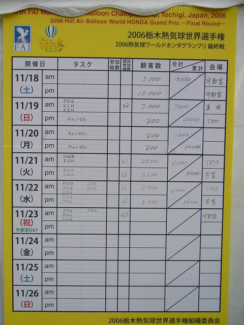 ■20061123栃木県熱気球世界選手権観客数など■主人と私は2006/11/23(祝)午後に行きました。ラッキーなことに、観る側にとっても分かりやすい、そして気球がすごく密集している「ミニマム・ディスタンス」(MND)という競技でした。みんな同じところで離陸して、定められた時間飛行して、ゴールのに戻る競技で、離陸地点からなるべく動かないようにして、ターゲットにマーカーを落とす。落とすまでは何度もターゲットのところに来ていい、とはいっても、風が相手!なかなか難しいものだな~と、素人ながら感じました。会場の片隅に、開催した競技の内容、参加機数、観客数、開催場所など書かれてました。 ↓ ■たくさんの熱気球■このページでは、撮ってきた画像をほとんど並べちゃいます。題して、インデックス並べ。これだけ作るのも、けっこう大変でした^^; このうちのいくつかを、いくつかの日記に分けて、大きくしてアップしますね。■もっと大きい画像を並べてます、続きも観てね■2006/11/23の「気球競技(画像多数)2」1つの気球が膨らんで離陸するまでを見せてくれたデモンストレーションというかんじでした。2006/11/23の「気球競技(画像多数)3」「ミニマム・ディスタンス」(MND)という競技が始まった様子です。2006/11/23の「気球競技(画像多数)4」空に浮かぶ気球がいっぱいです。2006/11/23の「気球競技(画像多数)5」競技の後半です。「宇都宮でのデモとビラ配りの警察署へ申請」どんな内容か、観てみる?■他の日の気球イベントも過去に書いてるのよ~■2006/11/20の「栃木で開催中の熱気球世界選手権」2006/11/22の「ツインリンクもてぎで熱気球体験 1」■参考サイト■★ツインリンクもてぎ 公式サイト 気球のことだけでなく、いろんなイベントがあります。★栃木熱気球世界選手権 2006年11月18日(土)~26日(日) ルールや歴史などが分かります。★ツインリンクもてぎスタッフによる 2006栃木熱気球世界選手権フォトログ★Super Balloons Blog もてぎ熱気球大会に参加する学生ボランティアスタッフのブログ■ランキングに参加してます■この日記に共感してくださった方、何かを得た方にお願い~。 よろしければ、ポチッと、どうぞ、お願いいたします^^;17:06