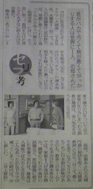 ■また新聞ネタ■2009/06/19(金)の讀賣朝刊、「放送塔」の近くの「セリフ考」に、明日が最終回の「夫婦道」の2009/06/12のセリフが取り上げられました。そうそう、「夫婦道」日記に書きたかったの~!毎回、良かった~!1回も書けなかったのが残念です。記事に取り上げられたのは、先週放送分。人間関係、単純じゃないから丁寧に書きたいけど、時間ない~、だから、簡単に書きます。武田鉄也さん・高畑淳子さん夫妻のお隣さんが橋爪功さん。橋爪功さんは武田さんの幼馴染。幼馴染だからこその会話がいつも良かった!その橋爪さんが付き合い始めた女性(杉田かおるさん)。その杉田さんに所に突然、若い時に生き別れた娘がやってきて、めちゃぐれて武田さんち(何で隣家で騒ぐ=主人公の家です)で大暴れ。一時預かる事になったけどお金まで盗もうとして、「私は親に捨てられた」と言い放って、その時その女の子に、武田鉄也さんがが言ったせりふ。「君がバカで汚くて柄が悪くてがっかりする人は世界に1人、お母さんだ」金八先生みたいじゃん~!と思う人もいるのかな?次男はそう言ったけど、私にとっては、ちゃんとお茶屋の頑固おやじ=高鍋康介さん、お茶のことばかり考えてる人。■本当は毎回、良いセリフありました■ セリフも毎回良いものがあったけど、それだけでなく、色んな人間関係で、いろんな人年代や立場人の、思いや、言葉、行動が、よく描かれていて、最近の薄っぺらに感じるドラマと違うな~と思ってました。だから、本当に書きたい事いっぱいでした。みんな芸達者で、だから、本当に楽しめました。しずちゃんも、ちゃんと女優してたと思うし、たまにある怪力シーンも良かった~。最後に「夫婦道 教訓」が、犬小屋の犬と一緒に出るのも、良かった! ■みんなが自分のご近所みたいな■毎回、笑いたっぷりで、家族、姉妹、親子、ご近所、お隣さん、他人など、希薄になった人間付き合いをおぎなってくれるようなドラマで、楽しませてもらいました。みんなが、お互いの長所も短所も知っていて、ひどい事も言うけど、根があるわけじゃなくて、お互いへの思いやりがあって、優しさがあって、喧嘩したり揉めたりするけど、丸く収まる。実生活も、そうでありたいですね。■こういうホームドラマって■ホームドラマでしょ?金八先生がかぶるし~なんて観ないのは、損です!同じホームドラマでも私は○田○○子さんでしたっけ?あれは私は苦手なんですが・・・。昔はこんなふうに、みんなで、もっとやりとりあったんじゃないかなって、「ちゅらさん」観た時の憧れ、みたいなのが有ります。彼の脚本も、いつも私好きです。3人姉妹の下に1人いる男の子が、けっこう上の姉たちにないがしろにされてて、でもその男の子が冷静に皆を見ていて、そういう人間関係の中で、色んなことへの対処法や考え方、人への思いやりなどを身に着けていくんだよねって、すごく思わされるドラマです。いい年してる私でさえ、こんな人間関係の中で育ってないです。今現実の生活が人との関わり方が希薄だから、色んな立場や年齢の人の思いや行動を見て、なるほどね~と学びながら観れて良いと思います。そういう点では、前クールで仲間由紀恵さんが出ていた「ありふれた奇跡」も良かったです!競演のカメレオン俳優・加瀬亮さんについても書きたかったのに、あ~!どんどん時間が過ぎた!■そういうわけで■明日は最終回だから、何か観るの無いな~なんて方は、ご覧ください。で、もし観て、自分と感覚が違うじゃん!ちっとも良くないじゃん!と思ったら、ごめんなさい~!私的には、1クールか2クール休んだあと、3シリーズ目でまた再開してほしいドラマです。■参考サイト■TBS「夫婦道」 公式サイト>夫婦道 :: テレビ番組 掲示板 - 受験 教育情報サイト インターエデュ・ドットコムなんか昼間派とある、そうね、最近は昼間に再放送あったりしますね。夫婦道 - YouTube 1:30 投稿者は、haiji2006さん。感謝です。番組が始まる前の歌の部分です。ありふれた奇跡 - Wikipedia