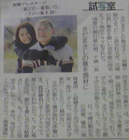 ■親父の一番長い日■今日の讀賣新聞の記事からだけで、5つ日記をかくつもりでしたが、時間なくてできません!大急ぎで、これ、ちょっと書きます。「さだまさしさんの歌は短編小説のようだ」と評されるのだそうですね。知らなかった^^;私は多くを知ってるわけじゃないけど、まさにそうかも、と、少ない知識で思い、ちょっと書きたくなりました。■今夜9時にフジテレビで2時間ドラマ■その記事があったのは、ラテ欄の「試写室」です。もう時間ないから、貼るだけ^^;主人が、このドラマについて、けっこう詳しく説明してくれたので、意外です!最後は涙涙だぞ~!ですって!私の「何で知ってるの?」に主人は、「私は(わたしはだと?)観たから」と返事をくれました。■他にも新聞を写メしちゃいました■でも時間ないから、明日かな~と思ってたら、へへへ、主人が、飲み行った~^^;↑ 6番の結婚式にあたる部分はドラマになってないのかな?あおれがあればたぶん号泣することになっただろうって記事にあります。ピンボケで、すみません~!國村隼さん、いい親父演りそうですよね~!娘は、長澤まさみさん!キラキラおメメの伊藤淳史くんも出る~!■公式サイト■親父の一番長い日 - フジテレビ■でね、1番書きたかったのはこれ■ものすごく大好きな、さだまさしさんの「フレディもしくは三教街」。さだまさし - フレディもしくは三教街 - YouTube 8:00投稿者は、1234abcdeeさん。感謝です。ロイヤルアルバートホールでのライブだそうです。もしご存じなかったら、アクセスしてみてください。出てくる名前がいいのです!「フレディ」なのです。クイーンのフレディとは、もちろん関係ないです~。美しい、物語のような歌です。情景も歌詞と思いも、とってもいいです。「ヘイゼルウッドのおじいさんのなんて深くて青い目」「いつでもパイプをくゆらせて、アームチェアで新聞を読んでた」あ~フレディ、フレディは midnight black のヘアと目だったけど~、フレディがおじいちゃんになるの、見たかったです~!と、物語とは別に、その歌詞の部分はFreddieMercuryの事をいつも思いながら聴く、この名曲~!■飛び交う戦闘機・・・■三教街ってどこだろう?なんか、セピア色の異国街、素敵です。ボンコのおばあさんって、なんだろう?漢口(はんかお)という地名。きっと調べればすぐに出てくるでしょうけど、まだ調べたことないです。それと、ちゃんとモデルがいそうですね。■THE 虎舞竜のロードも■前にロードの印税、22億って、すごいなんて、印税の事だけ書いたけど、あの歌は、ちゃんとモデルがいて、その思いが次々と歌にされてたんだと、後で知りました。あれも、泣きますね~・・・・。■「親父の一番長い日」もね■私はこれは知らなかったので、YouTubeに、アップしてくださった ryura3さんに感謝です。親父の一番長い日 - YouTube 10:23顔が親父に似たことを除けば~♪例えその役が一寸法師の赤鬼だったとしても♪さださんって、こんさーとでのMCもめちゃ楽しいんですよね、確か。笑わせて、泣かせてくれる、景色が浮かぶ、共感できる、みんなが抱く気持ちを言葉と綺麗な音楽優しい歌い方で代弁してくれる、天才ですね~!いまさら、私が言う事でもないが・・・・^^;もっと色々、関連動画で堪能したいですね~。でも、次の日記、いけるか~!?■う~、「金スマ」と「夫婦道」が、かぶってる~!■この「親父の一番長い日」と同じ時刻にやる金スマも今日観たいです。前に他の番組でだったかしら?脳をよく分かってるおばあちゃんが教える勉強法!この方、前にTVで見て、レポートしなくっちゃト思ってたのに、できてないです、すごいですよ!どれもHNKのように再放送してくれるといいのに~。「夫婦道」★もいつも観ていて、あれも良いドラマだから書きたい書きたいと思ってたのに、ついに最終回!今日の新聞でも、先週のセリフが良かったという記事が有って、「そうそう」と、朝から、日記に「見てなかったかたに、最終回くらい見てね」ってアピールしたかった~。あ=このフドラマは、毎回見てるからいい、っての、あるんですけどね。あ~!そういうわけで、私は、「親父の・・・」がいつか再放送されるのを楽しみにする、かな~?■追記■★「夫婦道」は水曜でした~!失礼しました~!2009/06/19 20:13誤字を直しました。21:22