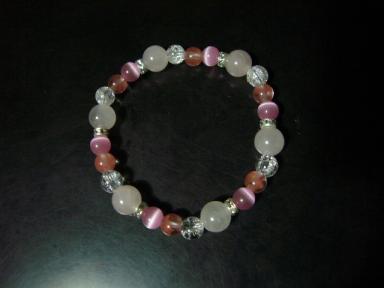 こんにちは。今日の大阪は汗ばむぐらいのご陽気です。季節の花さんのブログにお邪魔させていただいていて、パワーストーンに興味を持ち今日、初めてパワーストーンのお店に行ってブレスレットを買ってきました。効能別に色んな石の種類があるんですね。「こんな感じで。」と お願いして作ってもらったのがこれ説明してもらったけど石の名前がイマイチわからない・・・。ローズクォーツ、キャッツ・アイ… 後は何だろう?? どなたか教えて下さい。あっ、そうそう 犬の噛み癖防止にはアメジストが良いらしいですよ。でも、これって犬につけるの?飼い主がつけるの?少し勉強してみようっと♪我が家の場合、ぺリドットを入れれば良かったのかなぁ?