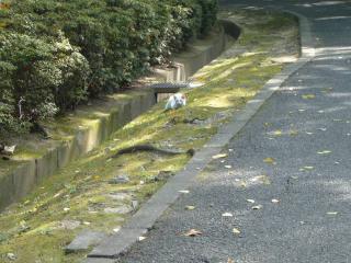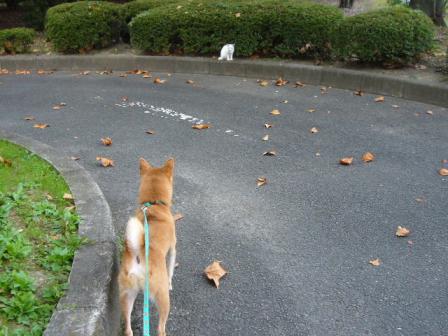 こんにちは、ダイのおかーさんです今日の大阪は暑すぎることも無く爽やかな秋晴れの一日でした。近くの小学校では、運動会が行われていて賑やかな音楽が聞こえていました。今日もクローバー公園にお散歩に行ってきました。この公園は広い敷地の中にあるのですが、野球、サッカー、アメフトの試合が行われていてスポーツの秋真っ盛りでした。お散歩を続けていると、真っ白な仔ネコちゃんに出会いました どうも、人懐っこいネコちゃんのようで溝から出てきてお座りをしてダイの様子を伺っていますダイはようやくネコちゃんに気づきすんごい嬉しそうな笑顔を見せてネコちゃんに近づいて行きます「ネコちゃん遊ぼ~!!」「ねぇ、何でそんなに怒っているの?」ダイは、ネコちゃんとお友達になろうと近づいて行ったのですがネコちゃんの方は「フーッ!!シャーッ!!」と ものすごく怒っているのです。怒っているのにダイは気にせず平気でどんどん近づいていきます。本当にお友達になりたかったのね。。。。あまりにもダイが近づいてくるのでとうとうダイにネコパンチを2回浴びせかけてきました。カメラを撮るのを止めて 寸での所でリードを引っ張って免れました。ネコちゃんは怖かったのね・・・。ごめんね。。。ネコちゃんは野良ちゃんだと思うのですが 真っ白でとても可愛かったです。