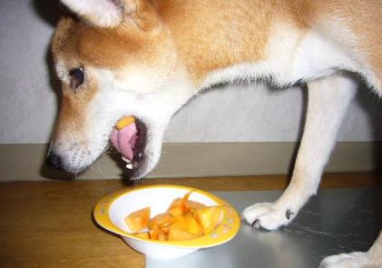 こんばんは、ダイのおかーさんです。昨日はお誕生日のお祝いメッセージをたくさんいただいて本当にありがとうございました。ホント皆さん、優しくていい方ばかり!!幸せを感じながら大切に読ませていただきました。ダイと一緒に三重県で生まれた三つ子の兄弟達も幸せに暮らしていますよ~に・・・と祈りつつ。。。今日のダイです。私の和歌山の実家から富有柿が届いたのでダイと一緒にごちになりました♪和歌山は柿の生産高が日本イチ!! 全国シェアは22パーセントだとか。 うふっ♪相変わらず美味しそうにパクついている事♪♪大きく開けた口の中で大雑把に切られた柿が踊っていますね~。 柿の渋(タンニン)には・・・ビタミンC・P・Eやミネラルが豊富に含まれているそうです。※抗菌・抗ウィルス作用・・・他の食品と比べても強い抗菌作用があるそうです。 ※血圧降下作用・・・血管の透過性を高めるらしい。 ※消臭作用・・・口臭・体臭・便臭などに効果が大。 ※悪酔い防止作用・・・柿には解酒に効果があると言われています。 柿は好き嫌いがはっきりしていますよね。みなさんはいかがですか?ちなみに私は大好き♪これからの忘年会シーズンや風邪予防に柿はいかがですか?出来れば、和歌山の柿をど~ぞ^^ おぃおぃ・・・(汗。