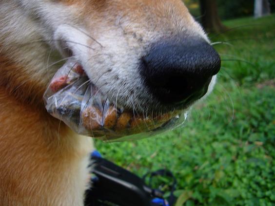 こんばんは、ダイのおかーさんです今日の大阪は天気予報が外れて お昼過ぎまで雨が降っていました。近くの学校の体育祭も明日に延期になったみたいです。こんな時、働くお母さんはお休みが取れなくて困るんですよね。お仕事から帰り、あまり足元がよくなかったのですがお散歩に行ってきました。ご機嫌よく追いかけっこをしていたらダイが○んちをしたのでその処理作業をしていたら、やられてしまいました。 何がって?? ウエストポーチのファスナーが開いていたので、ダイにオヤツ入りのナイロン袋をとられてしまいました。「ダイ、ダメ!」と言っても口から出すわけもなく、ヒゲもピンと立っています。取ろうとしたら「うぅぅぅぅ・・・」とうなる始末。このままだとナイロン袋のまま飲み込みかねません。ダイを後ろから抱きかかえるようにして 前足を掴まえて立たせてここから私とダイの根競べです。 約10分ぐらい、そのままの状態でいると・・・案の定、ダイは噛み直すために口からポロっと落としました。こんな時は、野生に戻っていて手を出すと怖いんですよね~でも、まだまだ おかーさんには勝てないよ! そんな笑顔でごまかしても今日はオヤツは抜きですよ!!!
