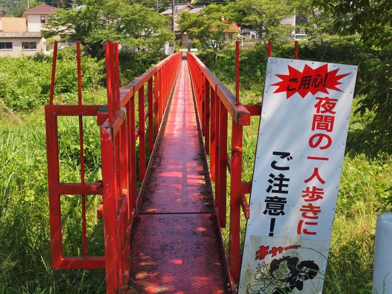 お墓に向かう途中に人が1人だけが通れる細い 赤い橋 がありました。100mほどありそうな長い橋。結構なにげに風で揺れていますし、きっとこの辺り夜は真っ暗になるのでしょう・・「 夜間の一人歩きに注意 」とのこと。 とてもじゃないけど1人で夜、ここに来ようとは思いませんが実に不思議な佇まいです。ちょっとしたサプライズスポットかも..。