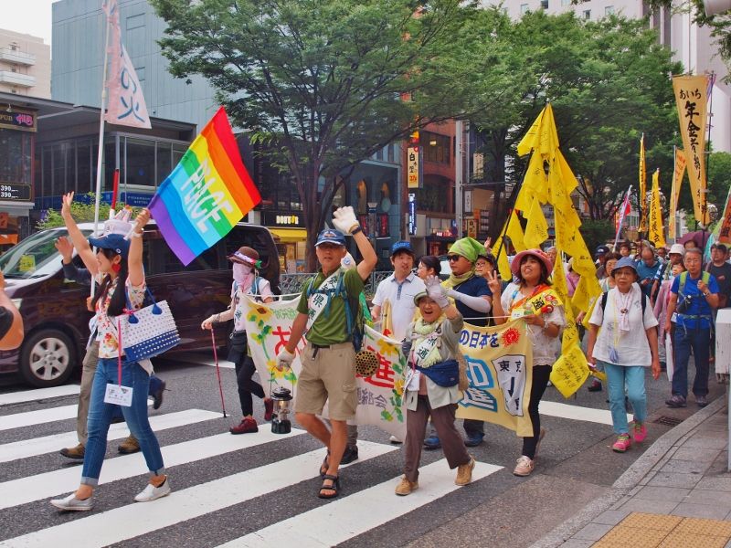 暫くすると多くの方が名古屋方面から本当に歩いていらっしゃって、思わず持っていたカメラで撮影。 スタッフの方にお声をかけつつ、お話を伺いつつ、、御一緒に暫く歩いていると、反対側からも別の行進が訪れ合流、そこでお別れして栄に向かいましたが、いつかユックリお話を伺えれば、、と思います。8月ではなく6月のこの時期に行進されている方々がいらっしゃる。