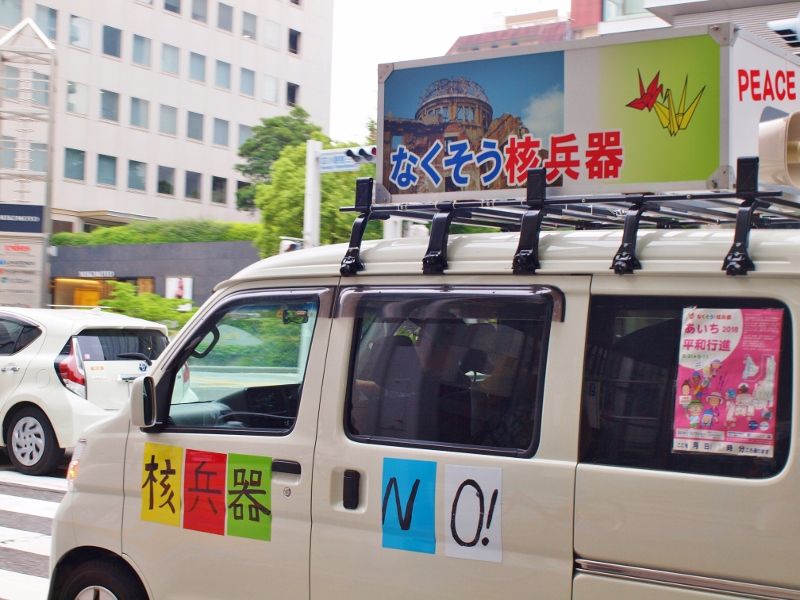 久屋大通りを歩いていると「 平和行進がやってきます 」という車が登場。原子爆弾のない世界を訴えていました。まるでJulio Martinezくんの作った映画「広島のビジョン」の世界にタイムスリップしたような状況が・・