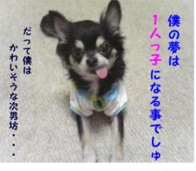 チワワの頭の形の事をアップルヘッドって言いますよね。 ゆずの頭もアップルみたいでしゅか?? 「ボクの頭にはペコがあるでしゅよ。頭蓋骨の所に隙間があるでしゅ。 このペコリンの所をゴチ~ンとぶつけると痛くてギャ~ギャ~泣き叫ぶでしゅ。 このペコリン、ふさがらないでしゅかねぇ?みんなはペコリンある??」 「ボクもアップルヘッドになってみたです」 「こっちはおにぎりヘッドですよ」 ・・・・・・・・ そんなマロさんに、ぬぅわぁんと、 この楽天ブログ内に親戚さんがいることが判明いたしました~(0^0^0)/~ノワーイ マロと親戚さんだったのは、yukka3650さんちのモモコちゃん そして、lovimamさんちのラヴィンちゃんです モモちゃんもラヴィンちゃんもとってもきゃわいい(*´▽`*)ポッ ラヴィンちゃんとはいとこで、マロの小さい頃の顔に似てるなぁ~って思うんです 生後6か月の頃のマロです。なんとなくラヴィンちゃんに似てると思いませんか?? でも今ではオマヌケな顔になっちゃったから、 小顔でとってもラブリーなラヴィンちゃんとはだいぶ違う顔してるけど( ̄▽ ̄) だって今のマロは・・・ ↑こんなだもんね・・・・ モモちゃん、ラヴィンちゃん、こんなアホ面マロだけど、よろしくお願いします(*^^*)